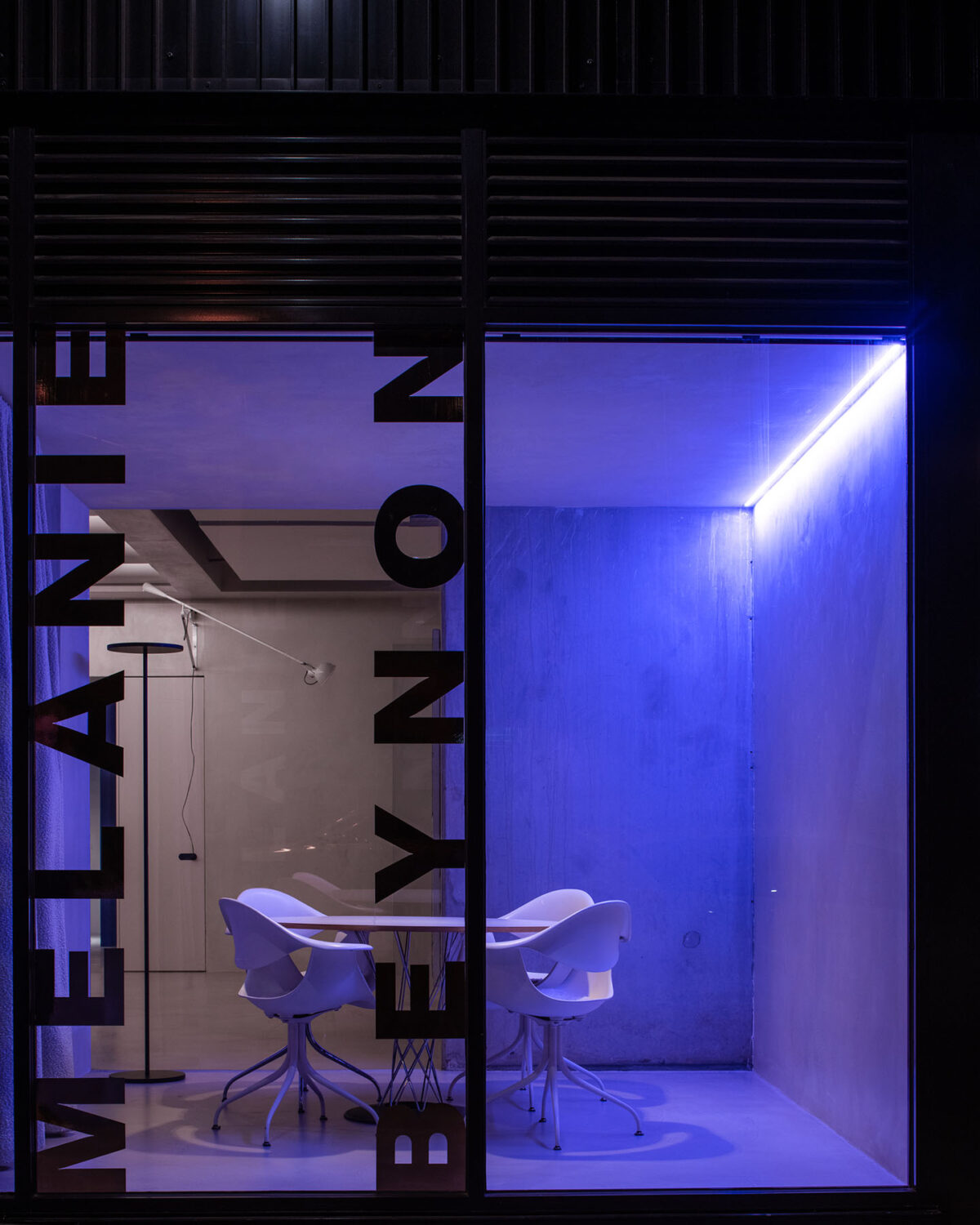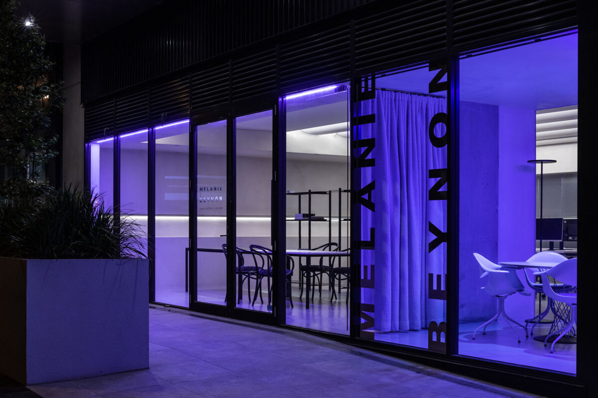 As a practice, we approach the concept of thresholds as permeable space, and our studio reflected this ethos using the façade as a tool to engage with the streetscape and the public. The shop front is intentionally transparent to the public, sharing a view of our process with the local community. The full height glazed facade allows natural light to bathe the interior during the day and offer a dynamic experience to the street in the evening. Our artificial lighting design penetrates the exterior by using colour changing wireless LED system that can be customised to an after-hours sequence.