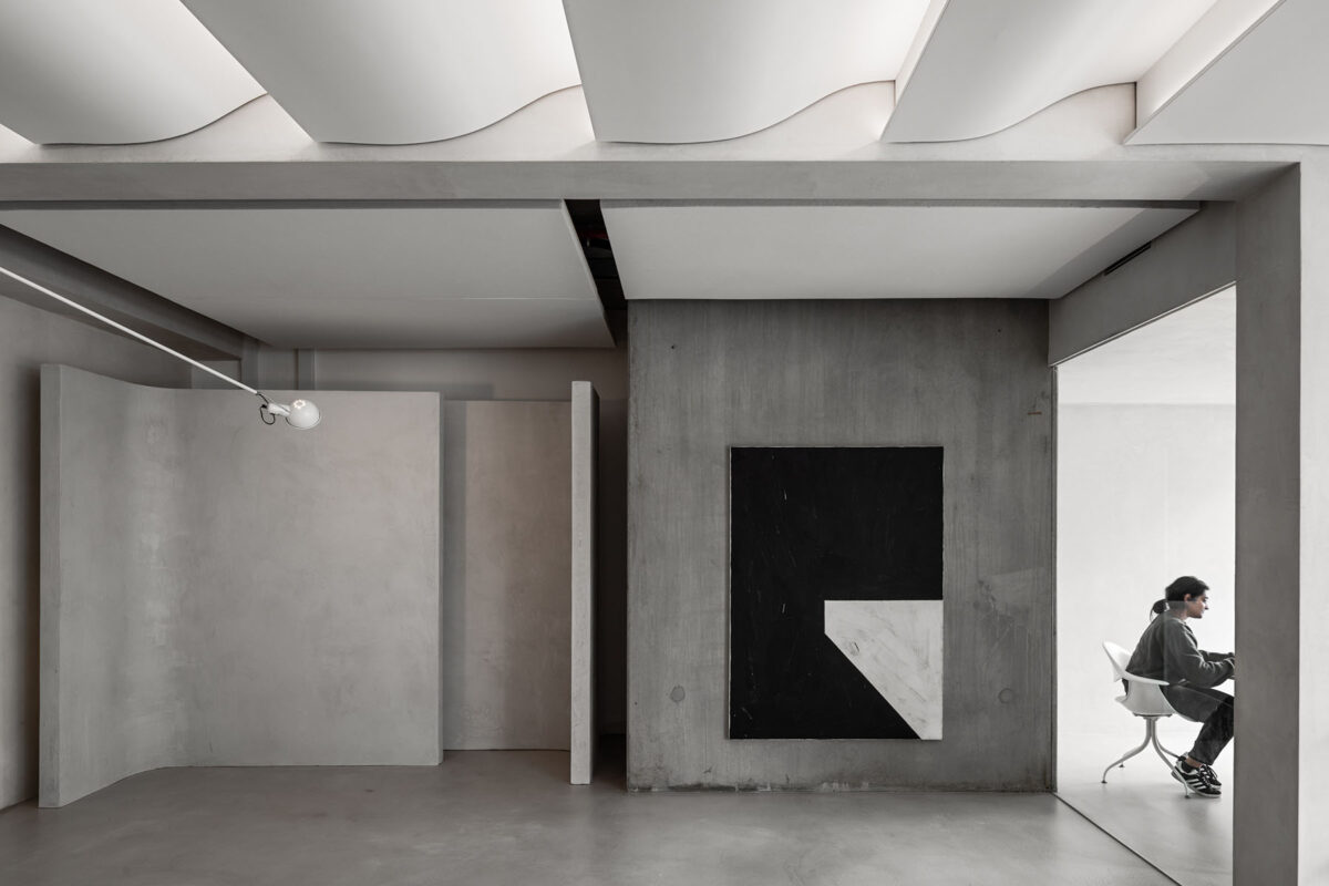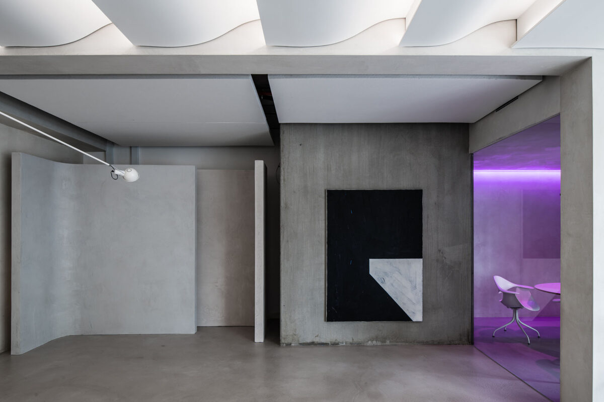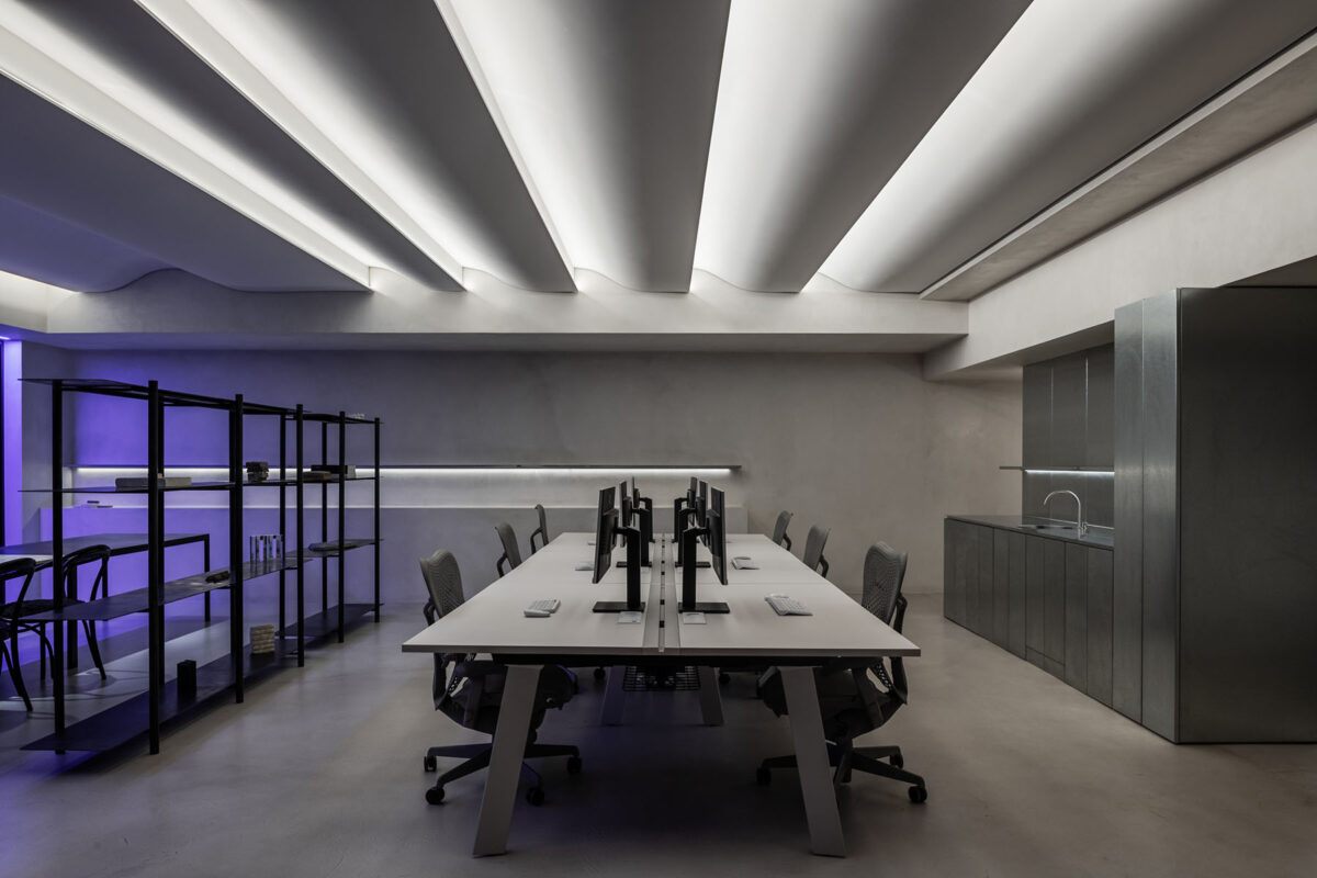 The feature ceiling is designed to facilitate indirect LED strip lighting integrated into rolling plaster wave forms. One of the constraints of the space was how the southern light fades throughout the day. Our solution is considered in the artificial lighting design, which can intuitively adapt by changing colour temperature and retain a comfortable working environment throughout the day. We also factored this into our spatial planning with the orientation of our workstations and meeting areas.