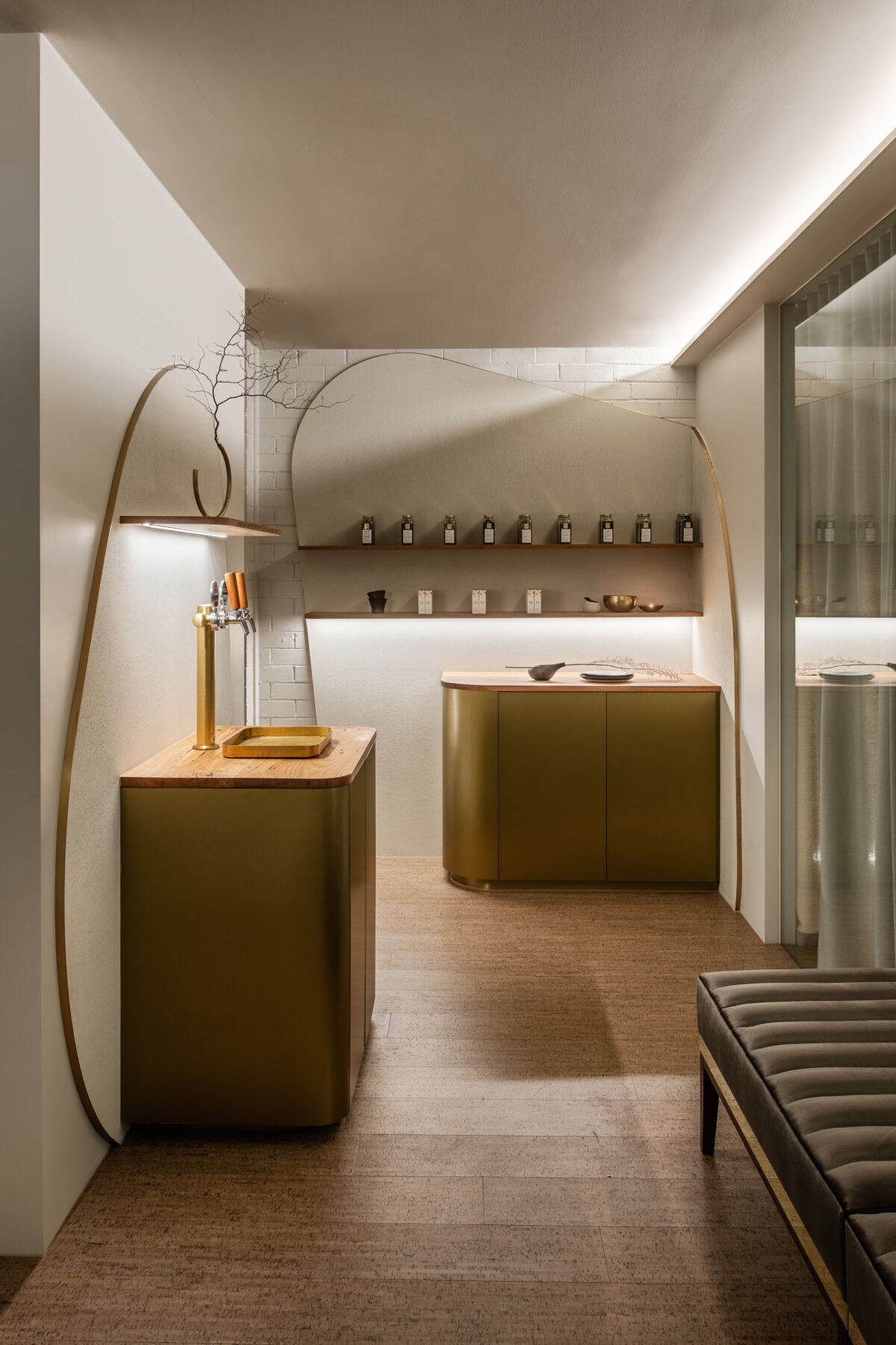 Interior climate is a key aspect in creating an optimum wellness experience. We integrated the controlled air system architecturally to direct air flow across the floor to minimise air movement in space, while the cork flooring is suspended above slab to maximise warmth to bare foot traffic.
